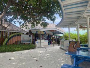 奥に見えるウォータースポーツセンターでシュノーケルの道具を借りていざ海へ!!